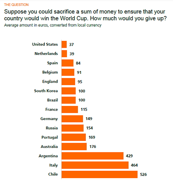 Inderdaad, de gemiddelde landgenoot heeft er een schamele 39 euro voor over dat Nederland de wereldtitel pakt. Internationaal gezien worden we in desinteresse slechts met een neuslengte geklopt door nota bene de VS. Misschien heeft het iets te maken met een afnemende meeropbrengst van al dat oranje.